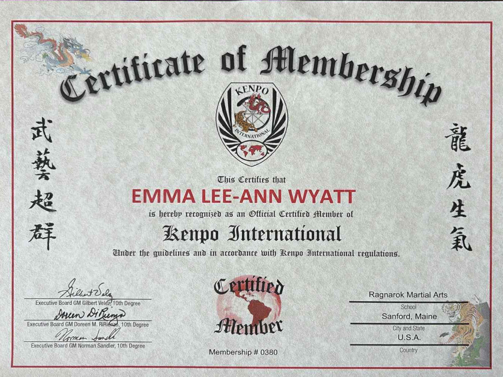 Kyoshi Emma comes from a long background in martial arts training. She started training in Shotokan Karate at the age of 5 years old. The school closed when she was 7 and she moved to training in Ed Parkers American Kenpo until she was 18. At that time, she was a competitor in the IPPONE Circuit and competed at the Ocean State Nationals when she was 17 where she took 4th place in fighting. She left for the US ARMY and continued with US ARMY Combative training until she was honorably discharged in 2012. From there she has continued to train in Kenpo and Ketsugo Jujutsu as well as Arnis.